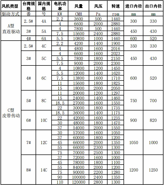 本公司生產(chǎn)的風(fēng)機(jī)引進(jìn)的技術(shù)為臺(tái)灣生產(chǎn),在臺(tái)灣風(fēng)機(jī)的型號(hào)大小稱作番,代表字母是#,但是在國(guó)內(nèi)統(tǒng)稱為號(hào),用A或C代表。